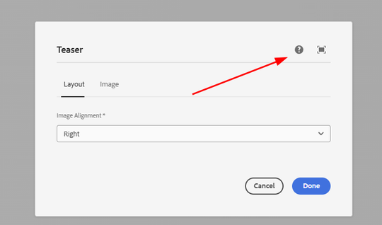 - Now enable and add the component to the page, open the dialogue and click on the Help (?) icon.